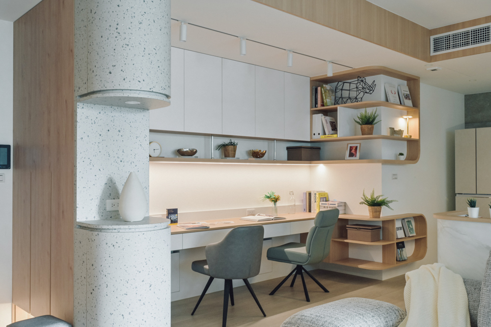 桌面可依空間與時刻自由延展,材質與色系皆可客製化,女性也能輕鬆調整桌面,讓生活節奏隨心調整。