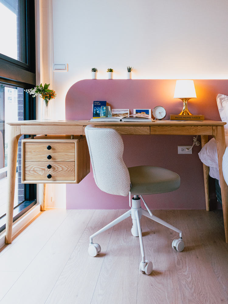桌腳與抽屜線條輕盈俐落,以日式簡約詮釋少女書房設計的純粹與溫度。
