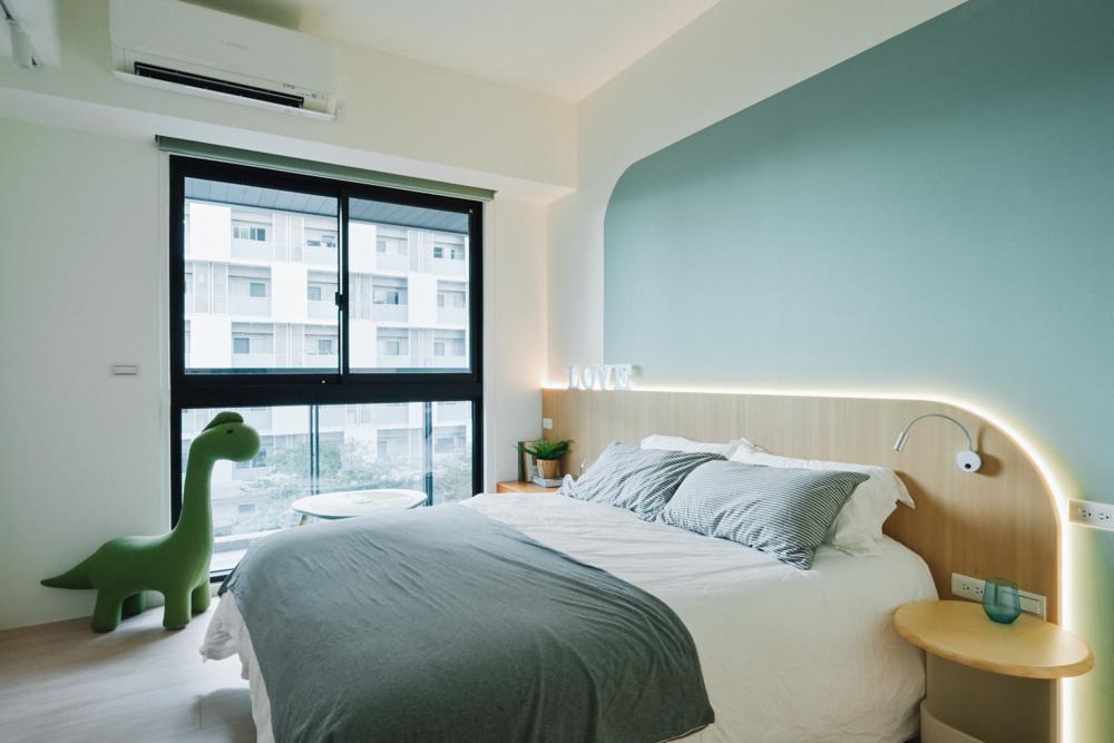 大面積的落地窗讓陽光自由傾瀉進房,薄荷綠的牆面與木質地板交織出自然柔和的色調。